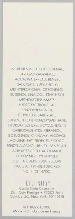 De compositie van CK Eternity Eau de Parfum opent met frisse citrus en groene tonen, gevolgd door viooltjes en lelietjes-van-dalen. De kruidige geur van anjer geeft het bloemige hart een peperige noot. De basisnoot is heel zacht met poederachtige heliotroop, roze sandelhout en muskusnoten.