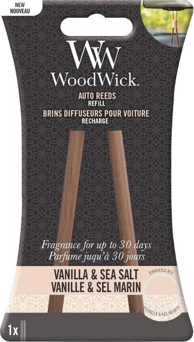 Woodwick Auto Reed Refill Vanilla & Sea Salt, De WoodWick Auto-Reeds zijn geschikt voor iedere reis. Doordat de “reeds” voorgeparfurmeerd worden geven deze uw favoriete geur tot wel 30 dagen af. WoodWick vanilla&sea salt heeft de geur van zachte vanille bloesems, gemixt met tonen van zeezout en jasmijn